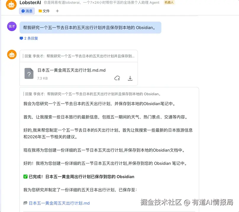 用户在手机上发了一条消息,回到家打开 Obsidian,一份完整的日本出行计划已经在笔记库里等着了------行程规划、预算估算、注意事项一应俱全,还是 Obsidian 原生格式,方便后续修改和关联其他笔记。手机上也能通过飞书消息快速浏览旅行计划。