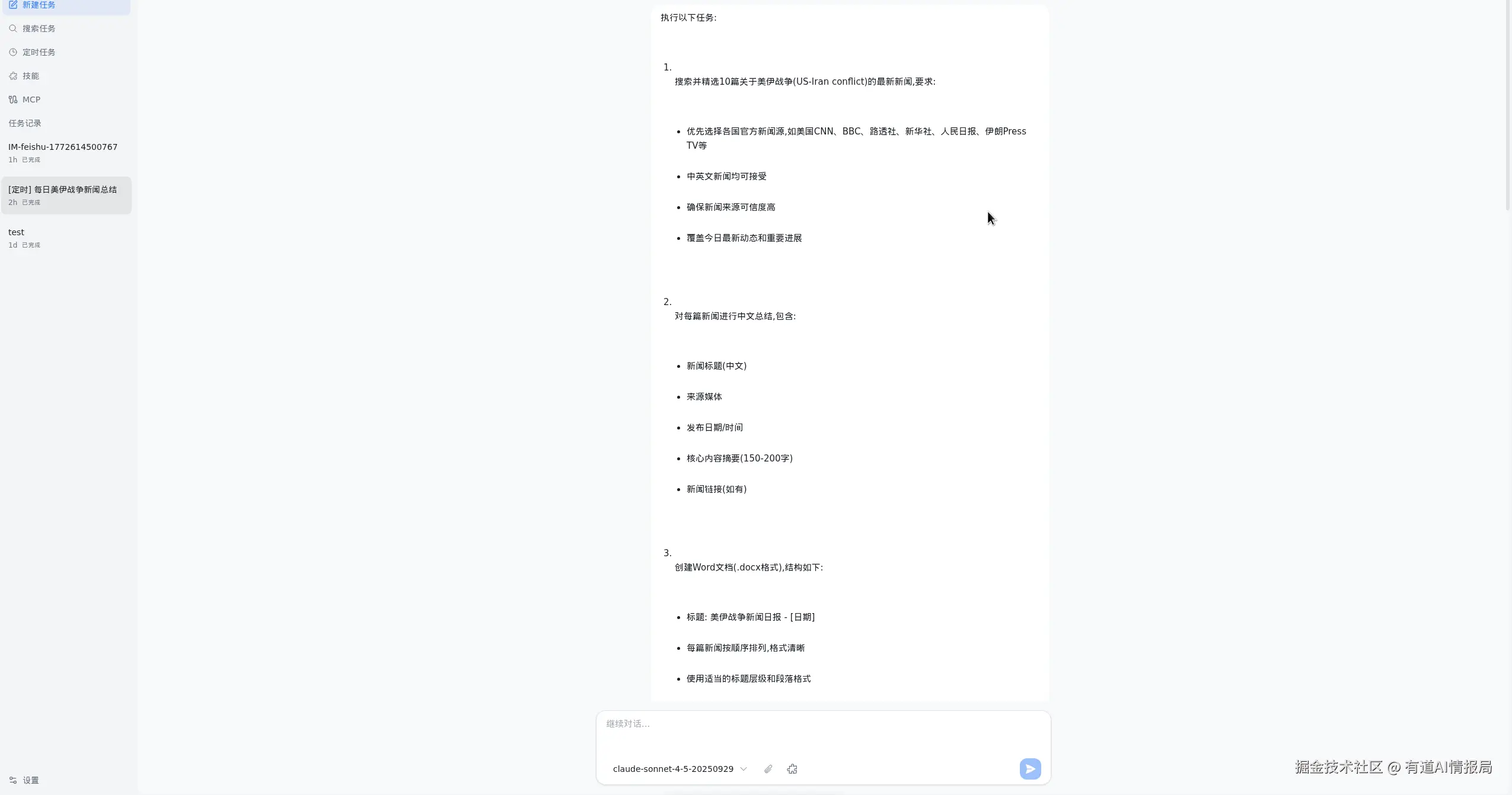 收到飞书消息后,LobsterAI 自动将任务拆解为:创建定时任务 → 多源搜索 → 筛选排序 → 生成文档 → 邮件发送。
