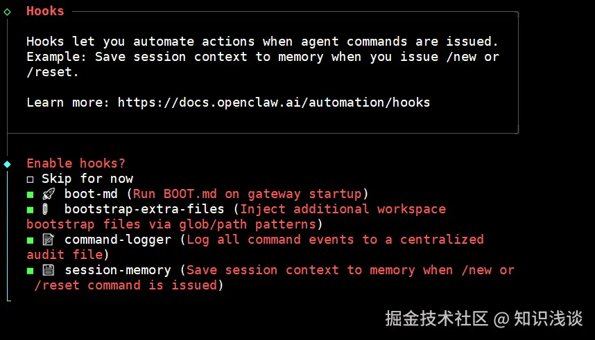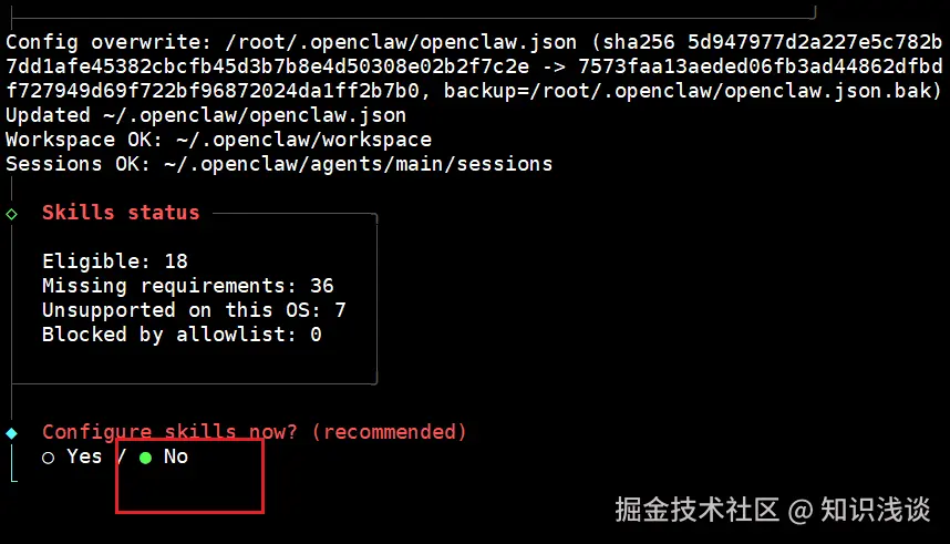 - 技能与功能设置:下一步 skills 能力选择 NO 后续根据需要让 openclaw 添加。