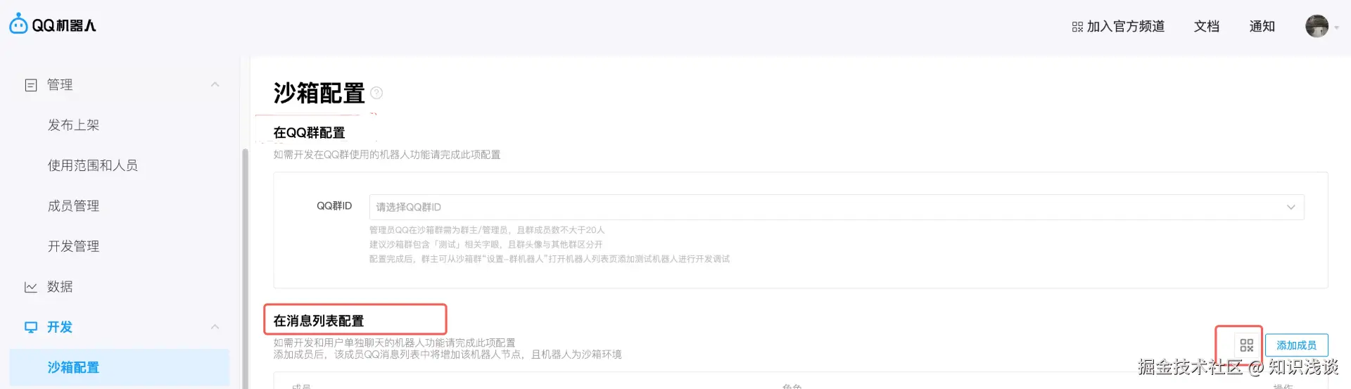 在 QQ机器人管理平台 添加成员后通过扫描二维码添加 QQ 机器人私聊。其余 QQ 机器人的配置信息请以 QQ 机器人管理平台文档为准。