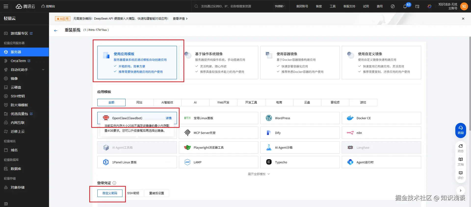 - 选择镜像模板:选择 openclaw 应用模板一键安装。