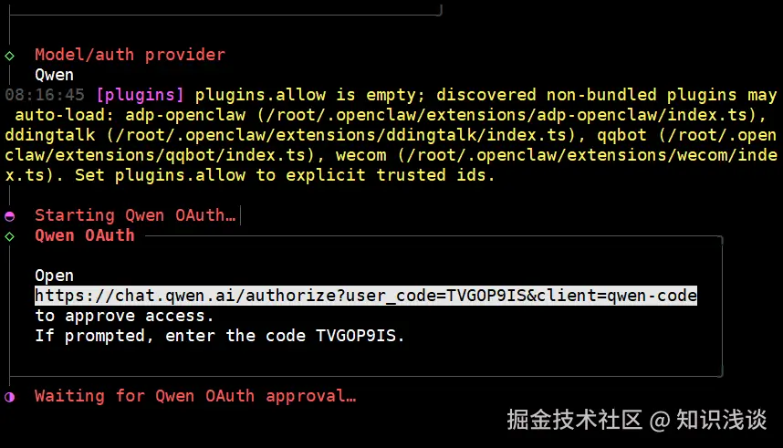 - 模型初选与授权:下一步选 Qwen (因为必须得选一个),一会在腾讯云控制台配置 Deepseek 模型。