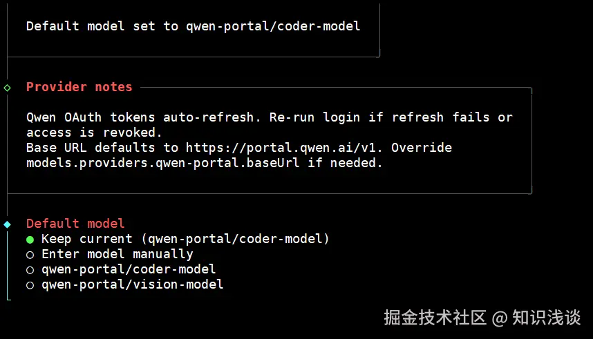 - 然后继续下一步,选择 Keep current (qwen-portal/coder-model)。