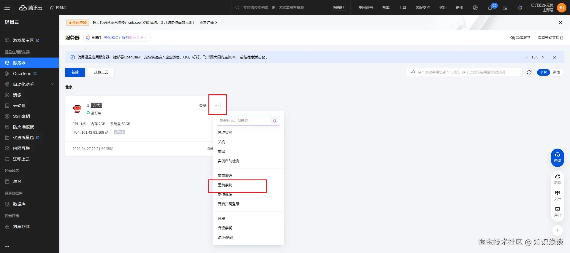 - 重装系统:安装系统,如果是已经购买的服务器,点击下图的重装系统。