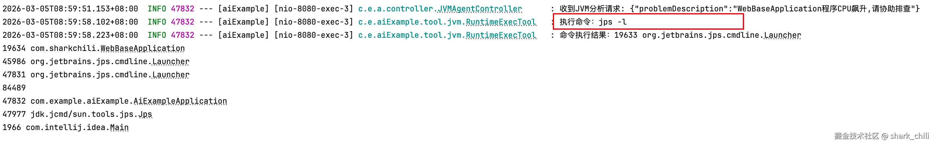第一步:按照skill的说明,agent执行的第一步是通过jps -l定位进程号,skill路径选择正确,工具调用验证成功:
