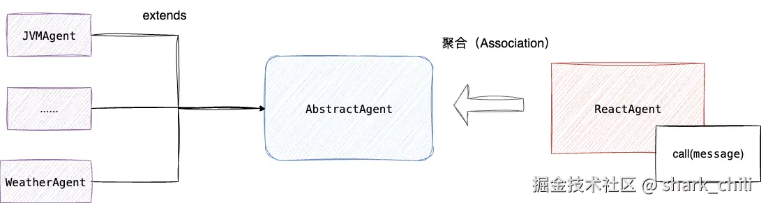 最后,我们需要将call接口封装暴露给外部,考虑call调用在未来的迭代可能作为项目中大部分agent都需要暴露的方法,本着DRY原则(Don't Repeat Yourself) ,笔者利用一个公共抽象类AbstractAgent完成ReactAgent聚合和call方法的暴露。后续需要暴露对话行为的agent,只需继承这个抽象类直接直接复用这些属性和方法: