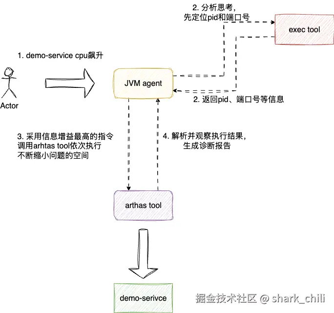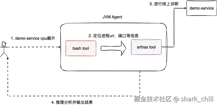 用户->agent:用户输入自然语言描述问题agent->skill:加载skill并通过skill对上下文进行增强skill->tool:基于意图,发起命令行工具调用,定位系统信息和java进程信息tool->arthas:通过标准化调用http请求对已装配arthas的程序进行监控诊断arthas->tool:收集监控诊断响应结果输出故障诊断报告