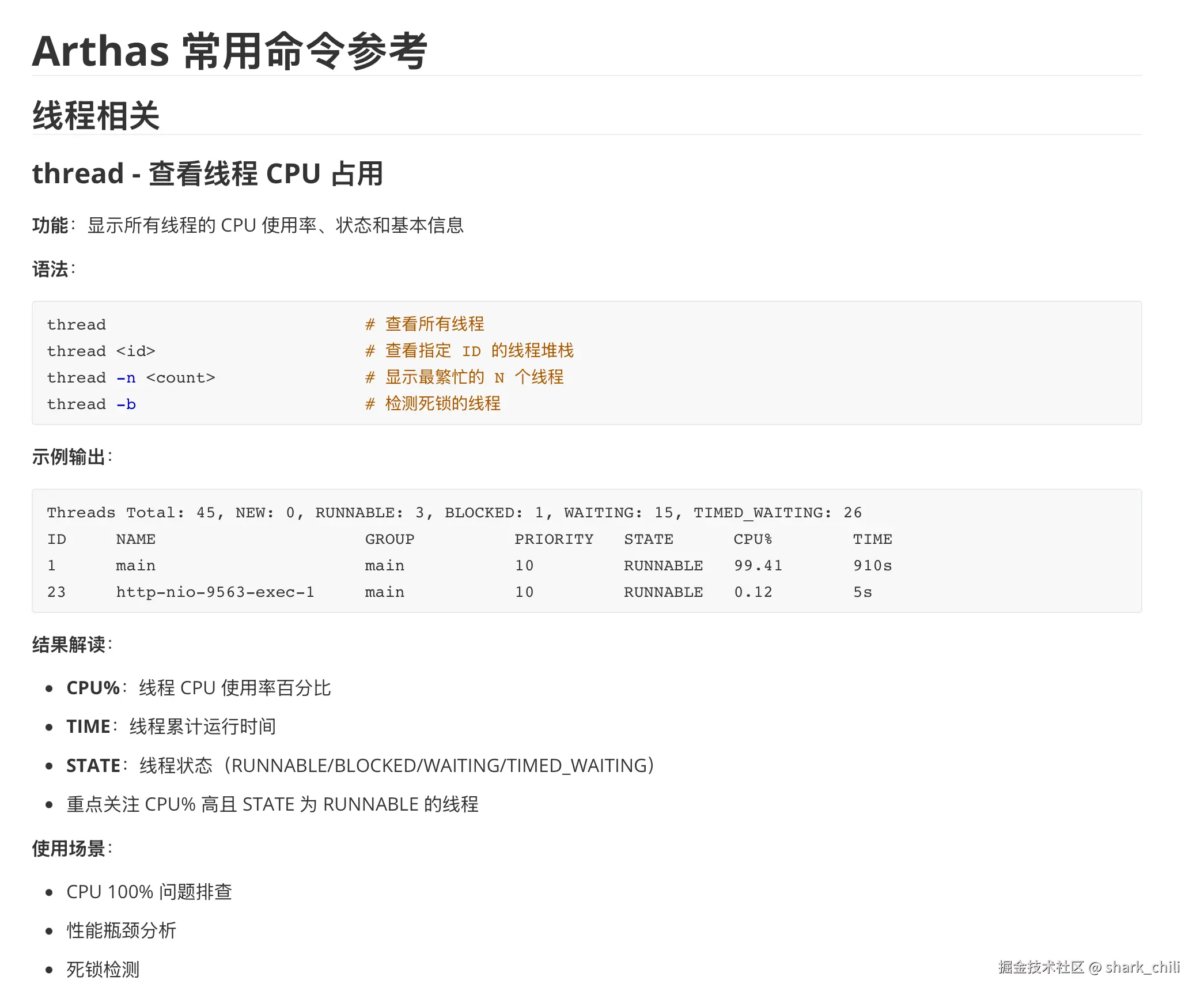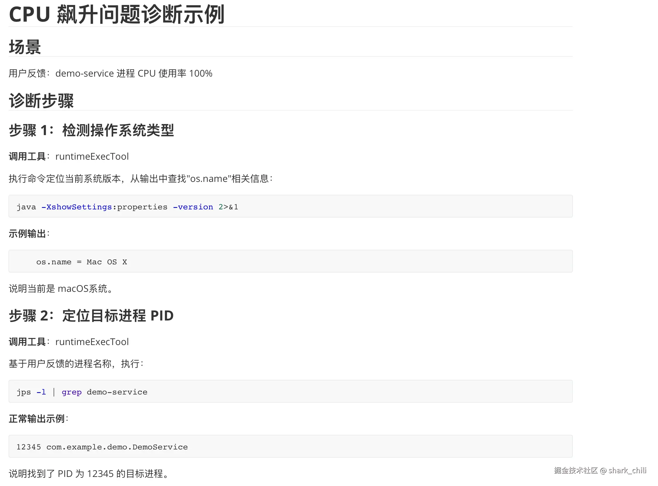 第二个问题是对智能体工作流的编排,在笔者在使用arthas进行故障排查的过程中,总结了一套可复用的确定动作链,其本质上就是一个状态依赖的决策过程,例如CPU飙升问题的排查步骤为: