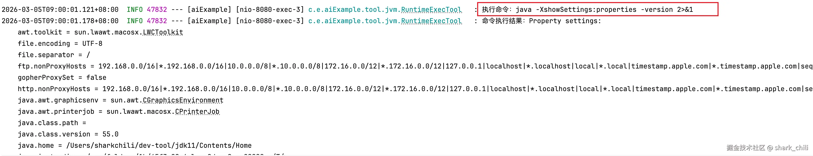 首先是工具的封装,我们先来说说命令行工具RuntimeExecTool,集成hutool之后,通过agent传入的参数作为执行的命令执行返回即可: