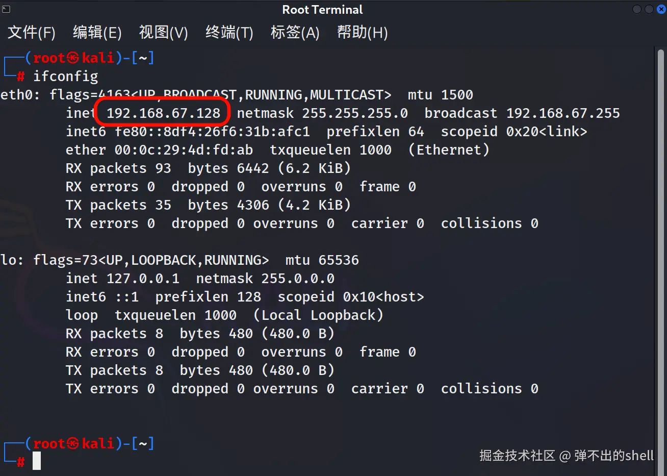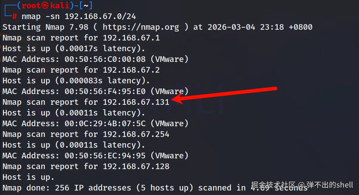 先查看一下本地网段,确认在 67 网段,使用 nmap 扫描存活主机: