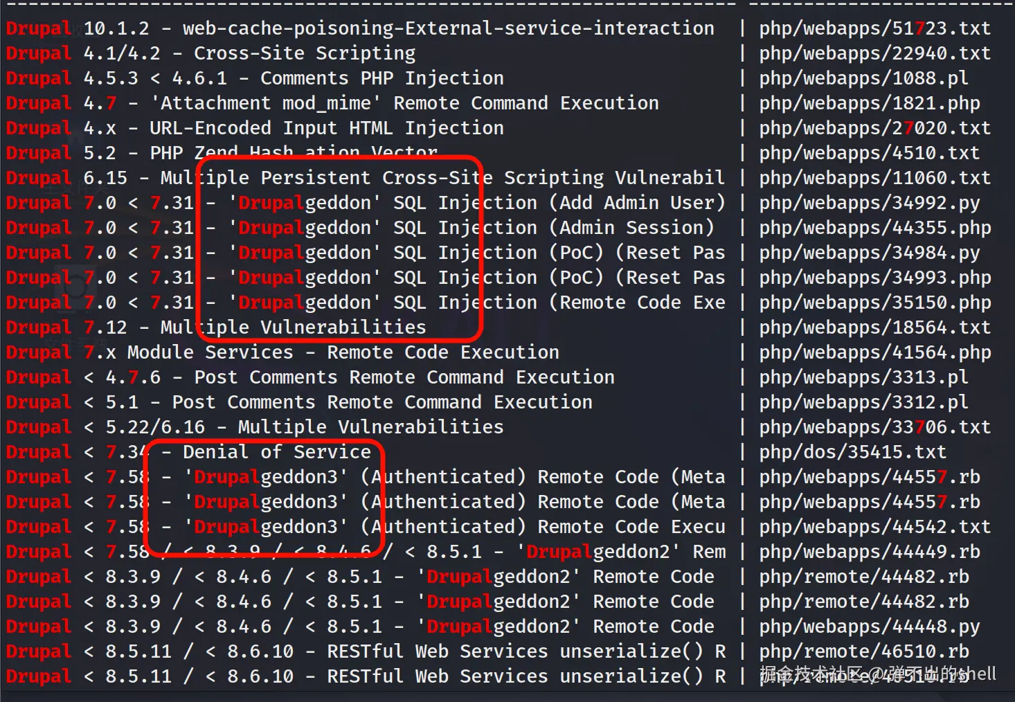 使用 searchsploit 在本地漏洞库中搜索 Drupal 7 相关漏洞: