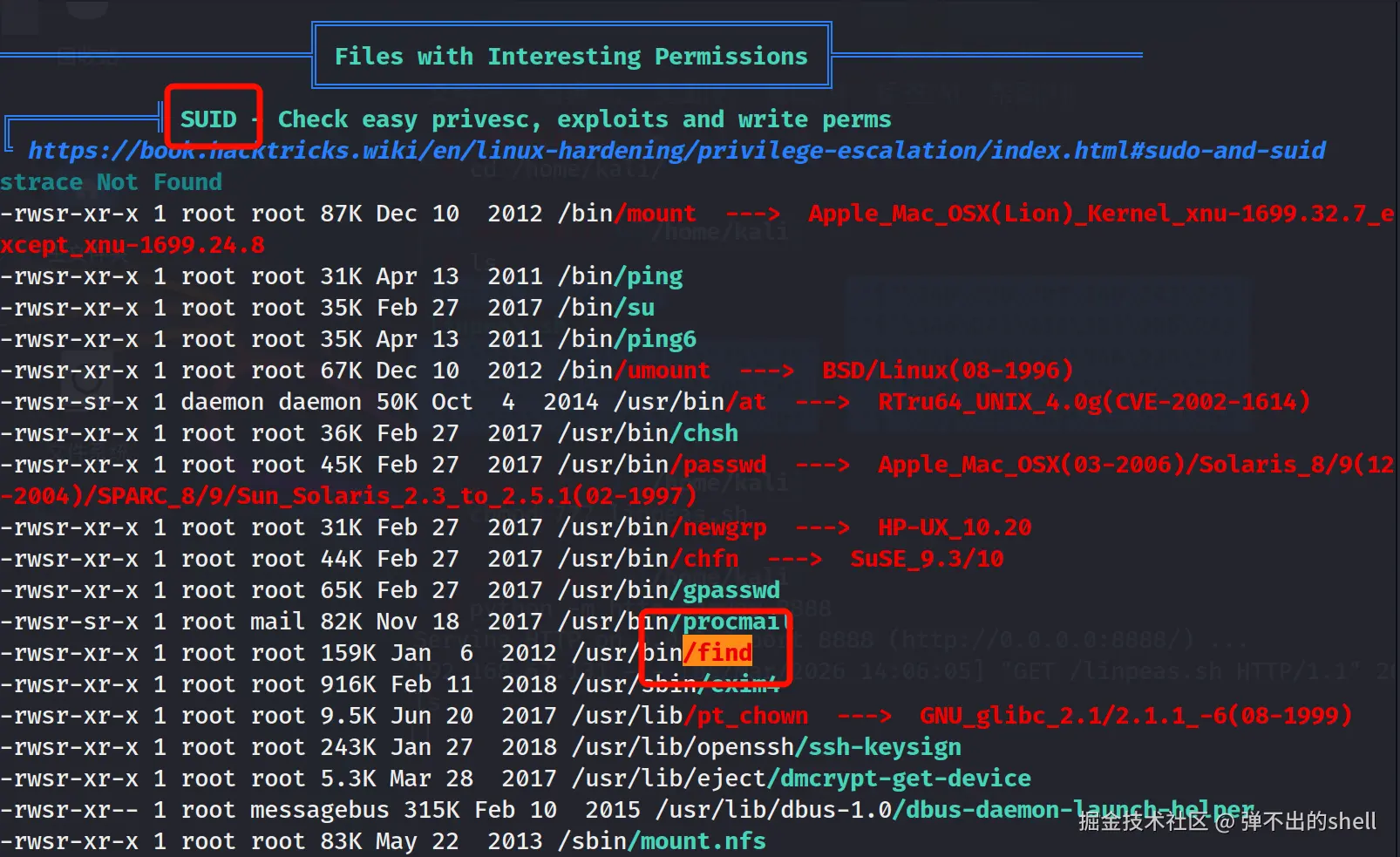 LinPEAS 输出结果中发现 find 命令具有 SUID 权限: