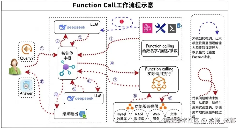 所以编程语言执行一个函数调用是再简单不过的事情了,Function Calling(函数调用)就是这么简单一个东西而已。白话的流程上面已经介绍了,如下属于更专业一点的 Function Calling 调用流程。