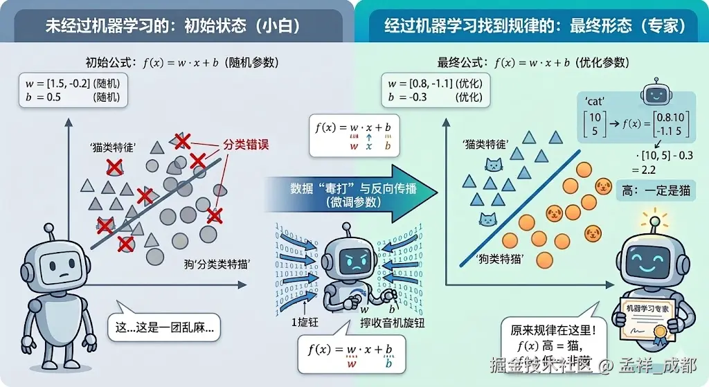 - 最终形态:经过海量迭代,机器找到了最完美的参数,那条线精准地划开了"猫"与"非猫"的界限。这就是机器学习最朴素的含义------让机器从数据中总结规律,而不是靠人手写规则