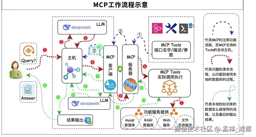 - 注入与识别:Agent 将"用户问题"与"从 MCP Server 拿到的工具定义"一并下发给 LLM