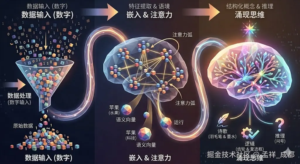 我们上面仍然没有解释一个问题,LLM 学习后的回答的结果,为什么看起来就像它会思考呢?其实,要解开这个谜题,我们得先剥开它"文科生"的外表,看看它"理科生"的内核。