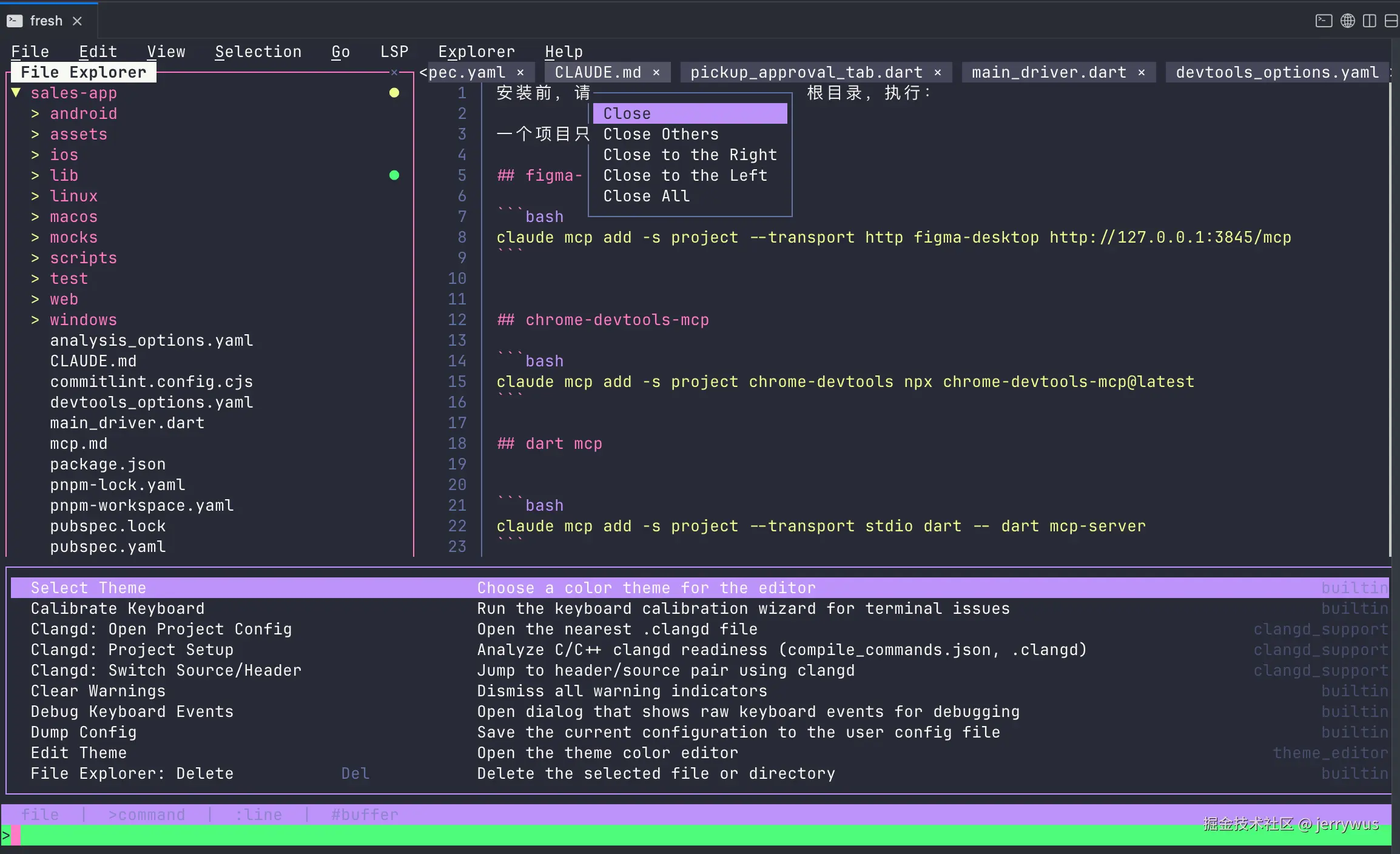 - 文件管理:内置文件浏览器,支持标签页、git 状态显示、模糊搜索