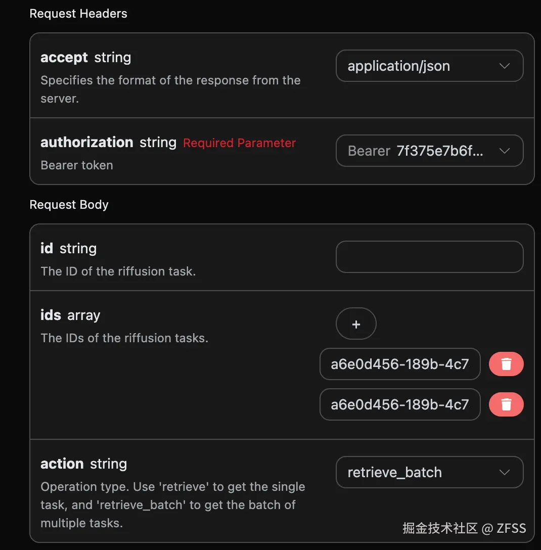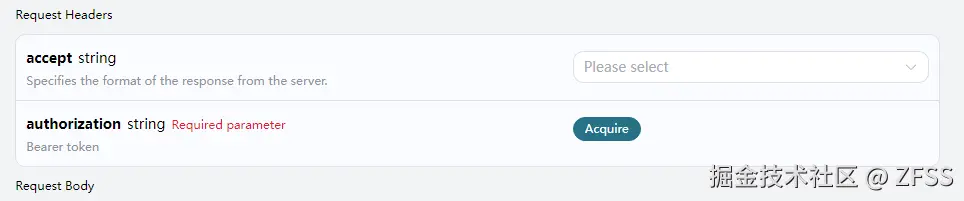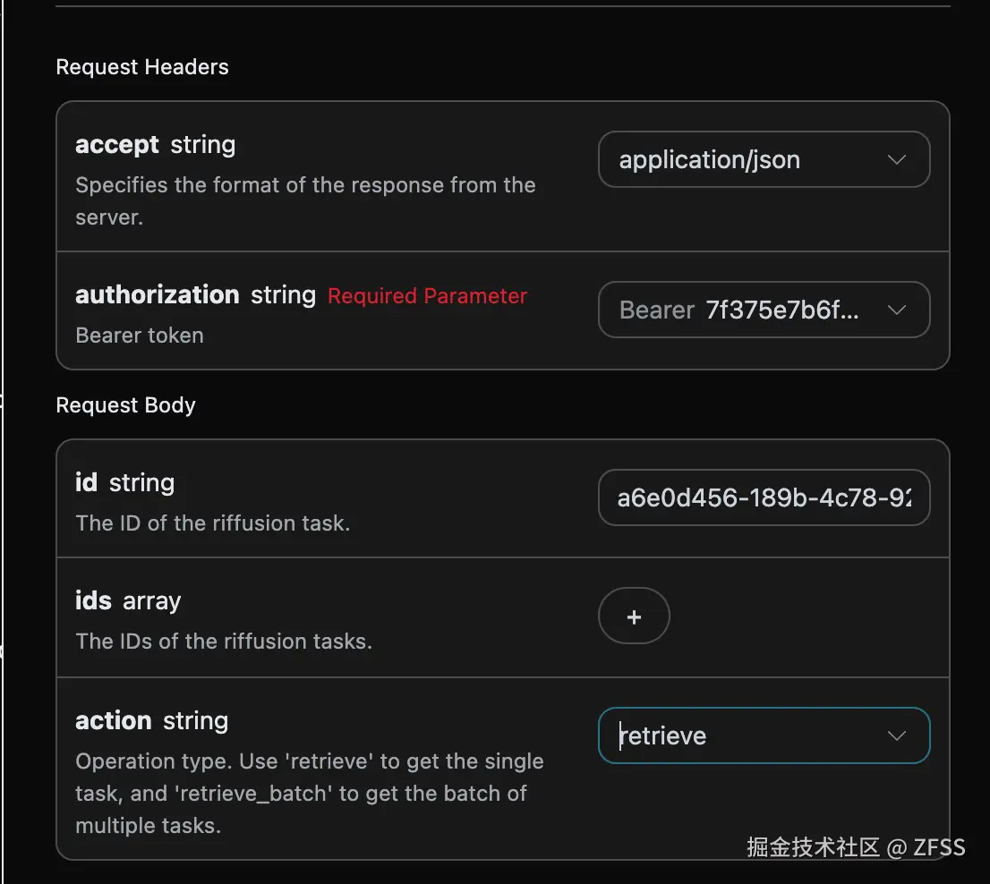 accept:指定接收 JSON 格式的响应结果,这里填写为application/json。authorization:调用 API 的密钥,申请之后可以直接下拉选择。