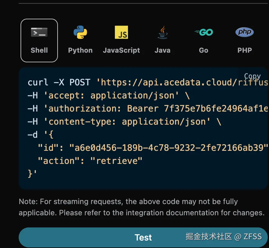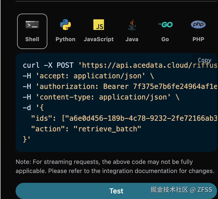可以发现,在页面右侧已经自动生成了各种语言的代码,如图所示: