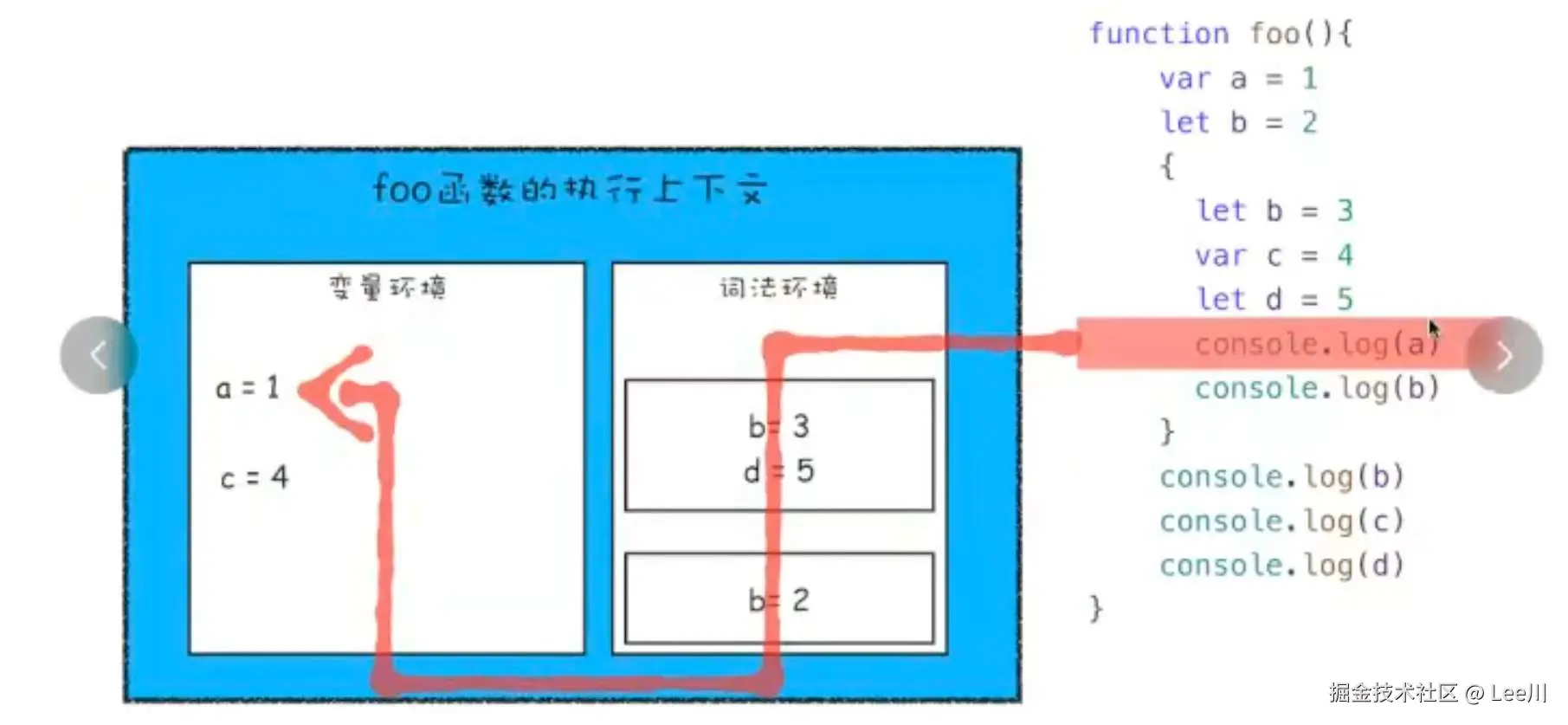{},引擎就在词法环境中压入一个新的"帧"(Frame)。 - 变量查找时,优先从栈顶(当前块)开始。