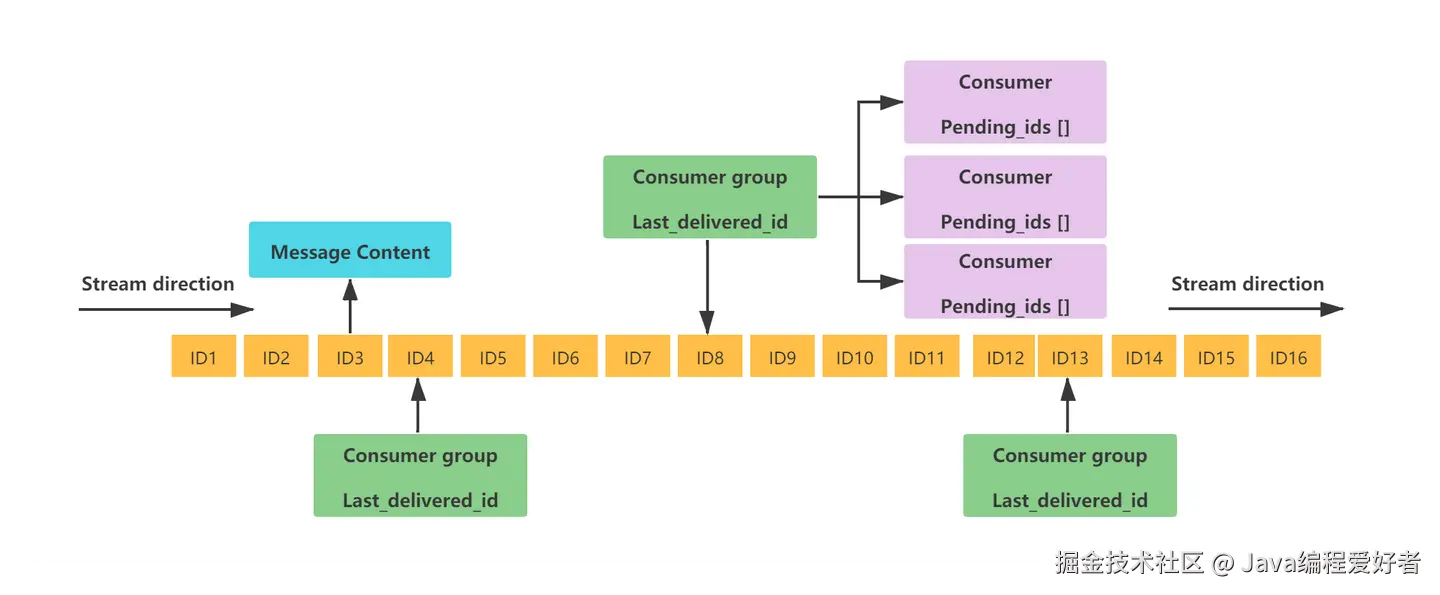 Consumer Group:消费者组用于组织和管理多个消费者。消费者组本身不处理消息,而是再将消息分发给消费者,由消费者进行真正的消费。last_delivered_id:标识消费者组当前消费位置的游标,消费者组中任意一个消费者读取了消息都会使 last_delivered_id 往前移动。pending_ids:记录已经被客户端消费但没有 ack 的消息的 ID。
