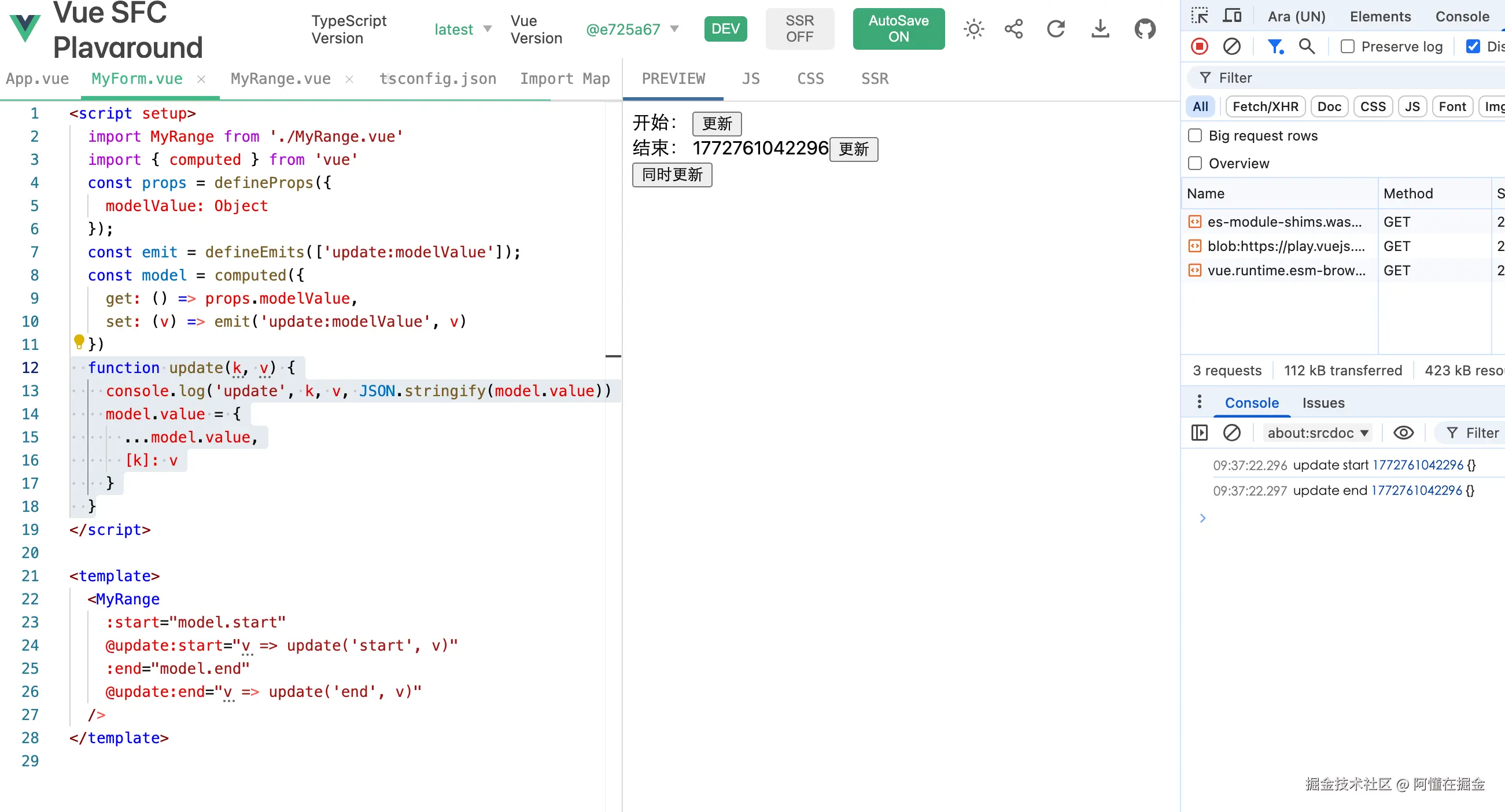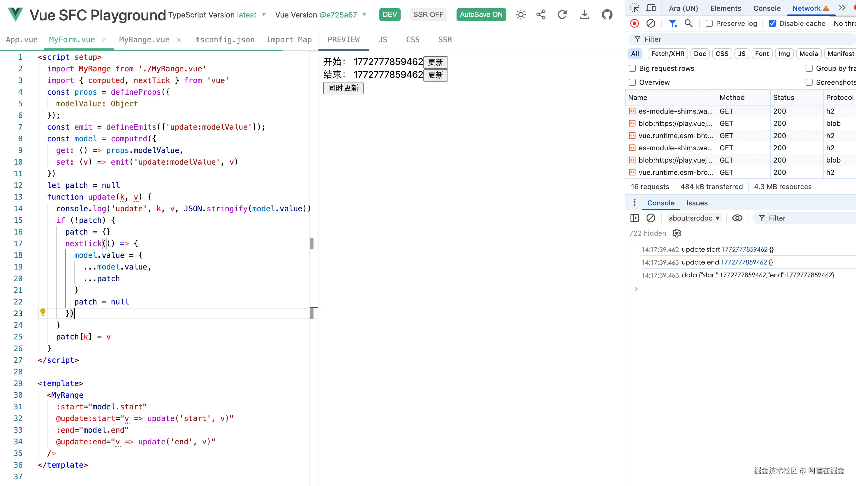 有些同学会说,既然单次更新可以,那就只用单次就行了。比如 MyRange.vue 接收并抛出 [start, end]。