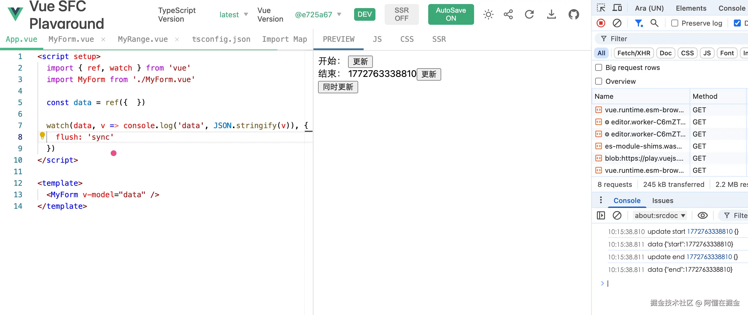 非常完美,update 触发了 2 次,App.vue 的 data 变化了一次:Playground