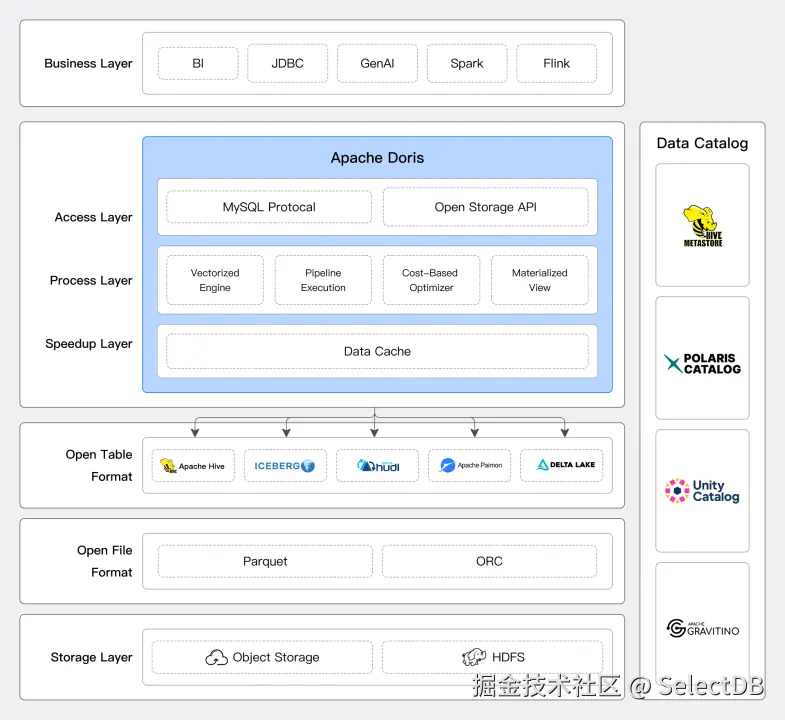 - Doris 定义了标准三层元数据模型:数据目录(Catalog)、数据库(Database)、数据表(Table)。无论是 Hive、Iceberg、Hudi、Paimon,还是支持 JDBC 协议的数据库系统,Doris 均能轻松连接并高效提取数据。