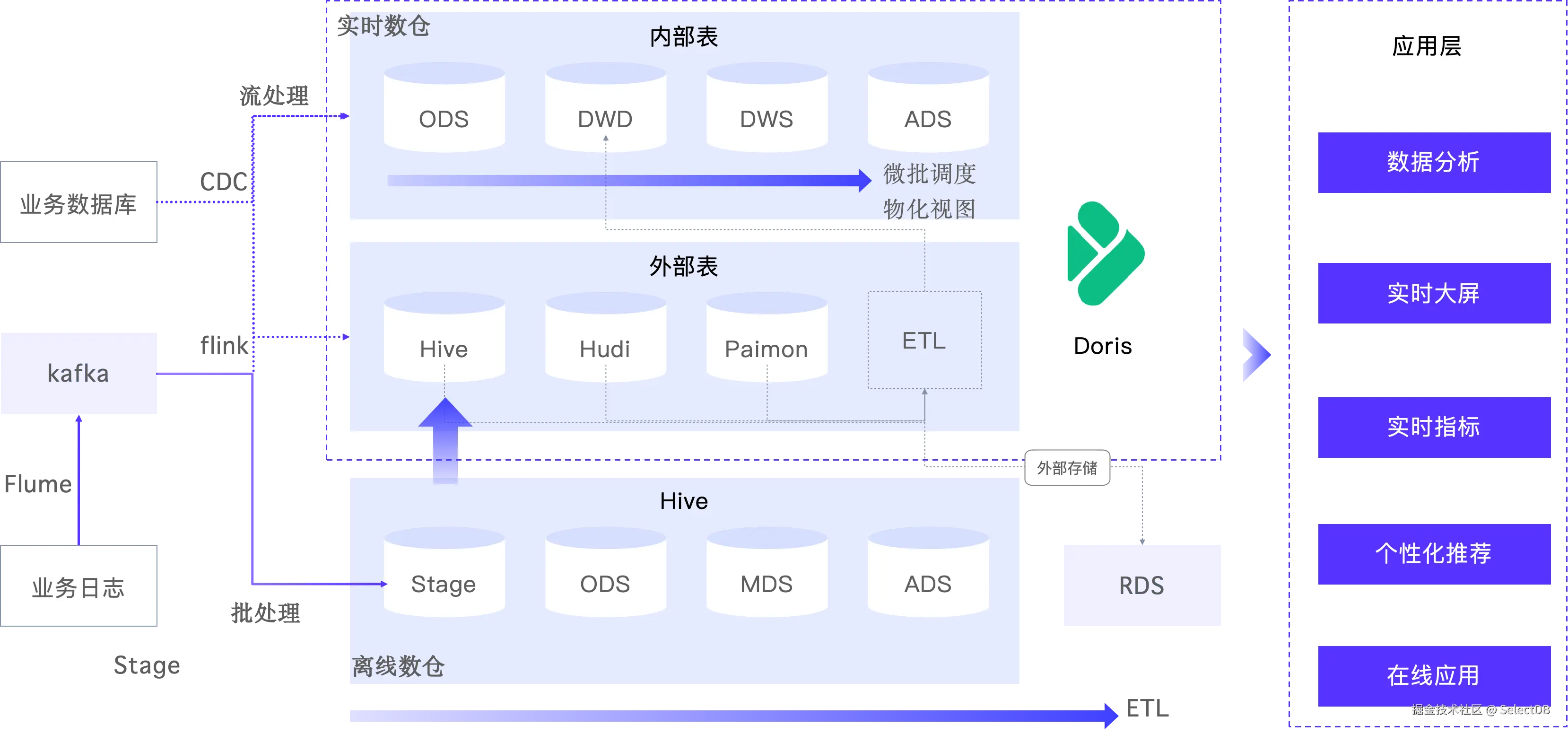 - 数据接入:实时数据链路中,业务数据库数据通过 Kafka、Flink CDC 实时写入 Doris;离线数据仍同步至 Hive 数仓,完成分层建模。