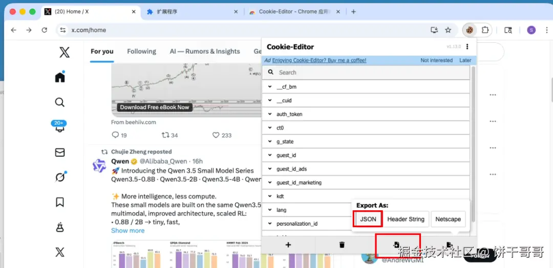 用浏览器扩展( 如Cookie-Editor 或 Get cookies.txt LOCALLY )导出 Twitter Cookie