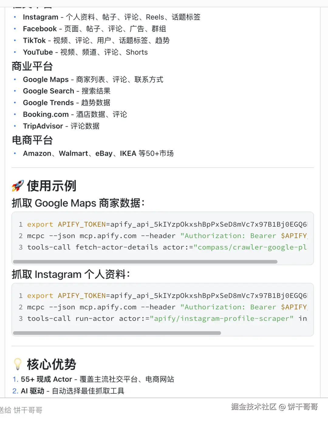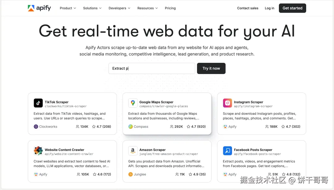 Apify 做了 20 年网页抓取,有海量已经调试好的 Actor(类似云端爬虫程序),覆盖 Google Maps、YouTube、Instagram、TikTok、Amazon 等主流平台。