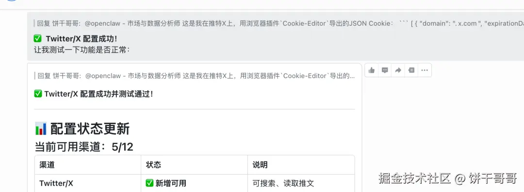 这是我在推特X上,用浏览器插件`Cookie-Editor`导出的JSON Cookie:```刚到出的JSON```参考这个方式配置到agent-reach里:agent-reach configure twitter-cookies "此处粘贴你复制的Cookie内容"