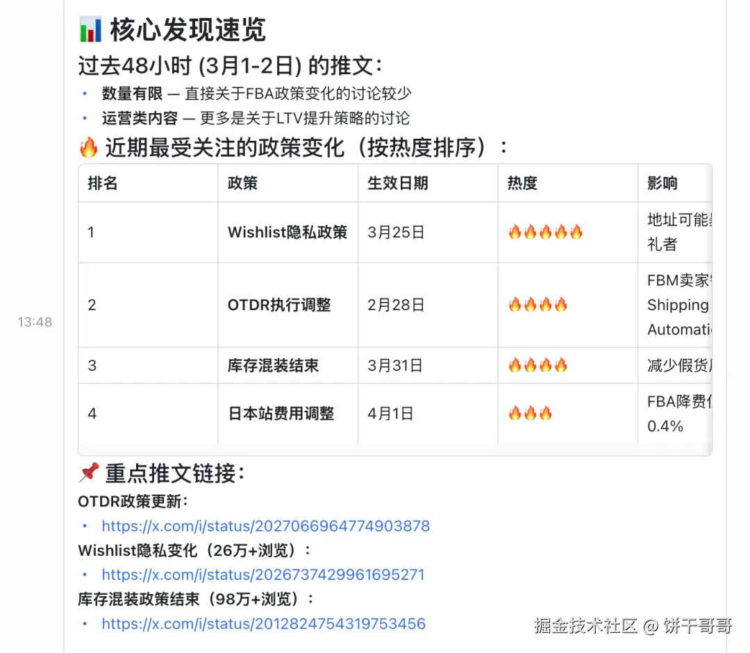 到推特,搜索过去48小时内提到 "Amazon FBA policy change" 的推文,整理出主要讨论点