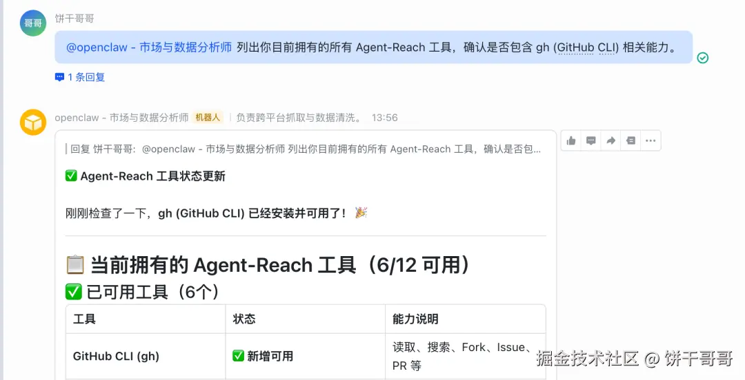 Agent-Reach 内置 gh CLI(GitHub 官方工具),让 OpenClaw 直接搜索仓库、读 Issue、分析 Star 增长趋势,比爬网页稳定得多。
