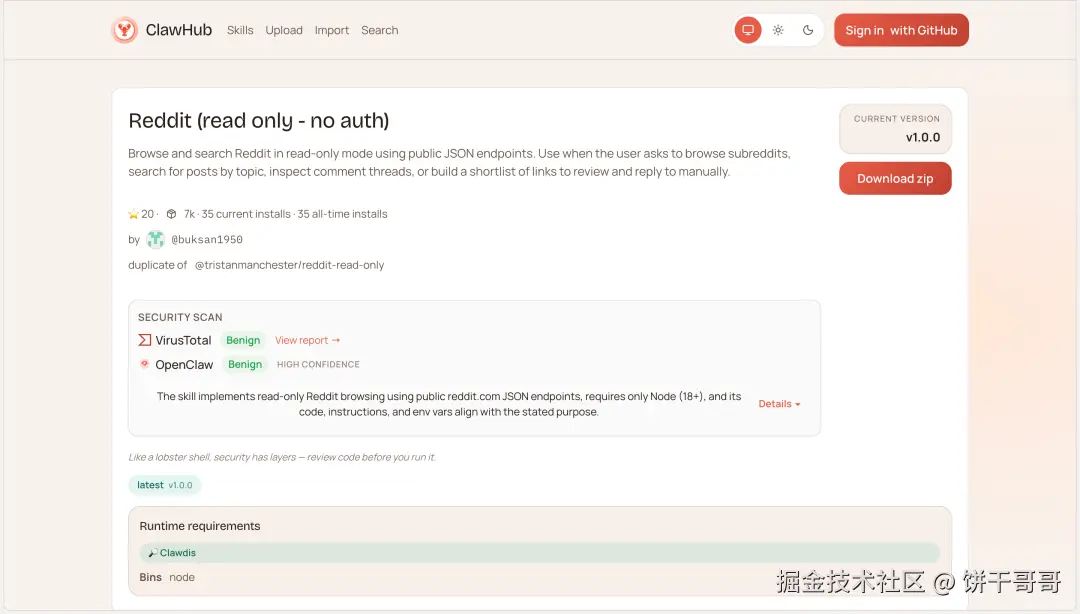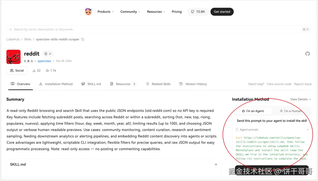 用 reddit-readonly Skill,底层直接打 old.reddit.com 的公开 .json 接口,无需任何 API Key。支持读版块热帖、搜帖子、读评论串。