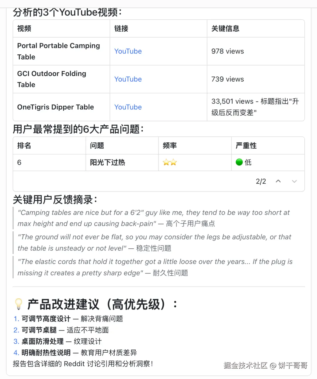 找3个 YouTube 上关于 "camping folding table review" 的视频,抓取字幕,提炼用户最常提到的产品问题
