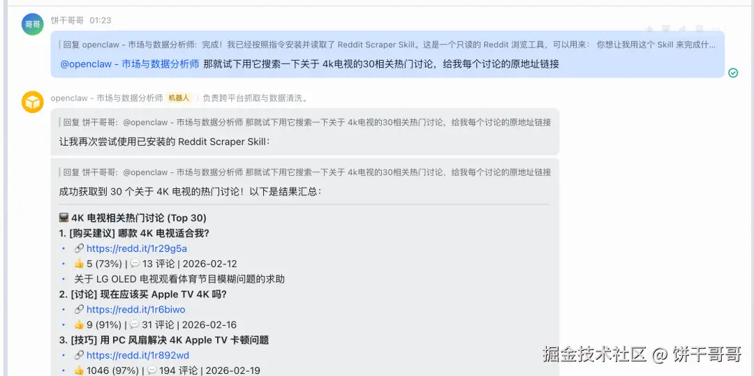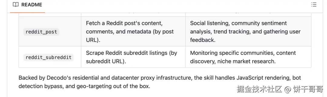 用 Decodo OpenClaw Skill,reddit_post 和 reddit_subreddit 两个工具,返回干净的 JSON,Decodo 后端有 IP 轮换,稳定性更高。