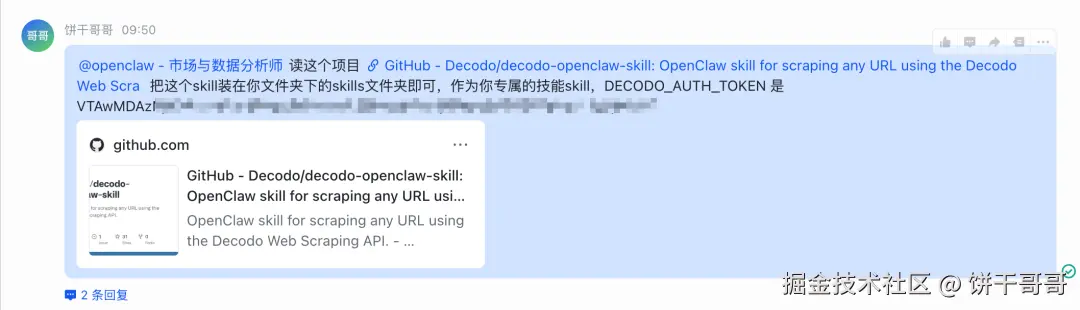 按前面安装Decodo OpenClaw Skill后,直接对 OpenClaw 说:
