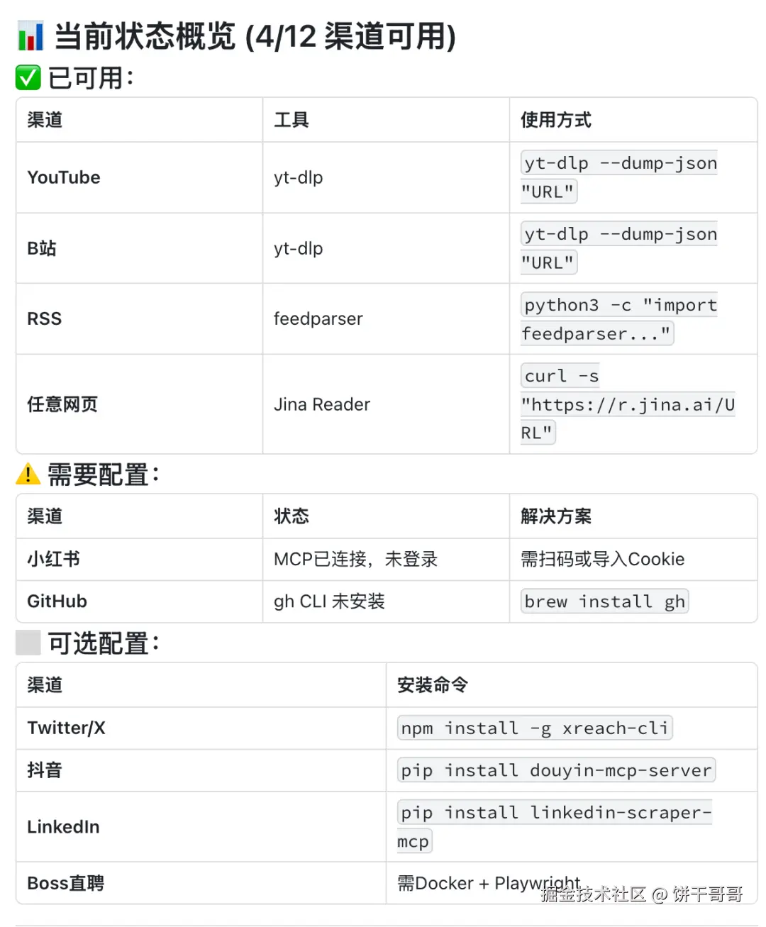 推特用 xreach(Cookie 登录,免费)、视频用 yt-dlp(148K Stars,YouTube 和 B站通吃)、网页用 Jina Reader(免费转 Markdown)、GitHub 用官方 gh CLI。