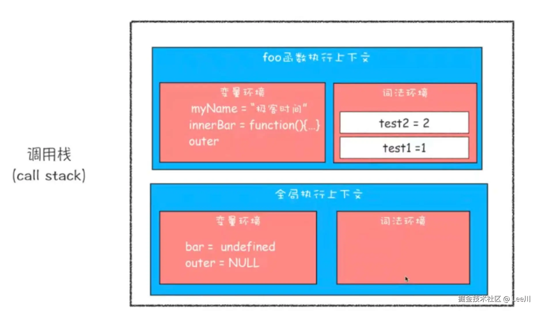 此外,每个上下文还持有一个指向外部环境的引用(Outer),这是形成作用域链的关键。