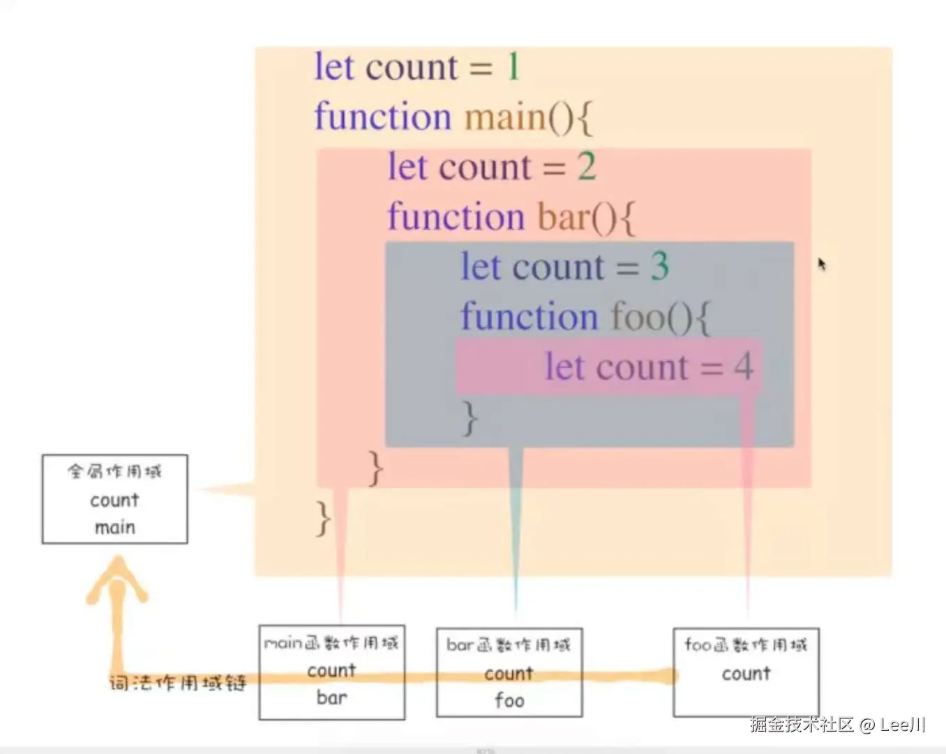图解 2 :这张图生动地展示了作用域的嵌套关系。下方的箭头链条(词法作用域链)清晰地表明: