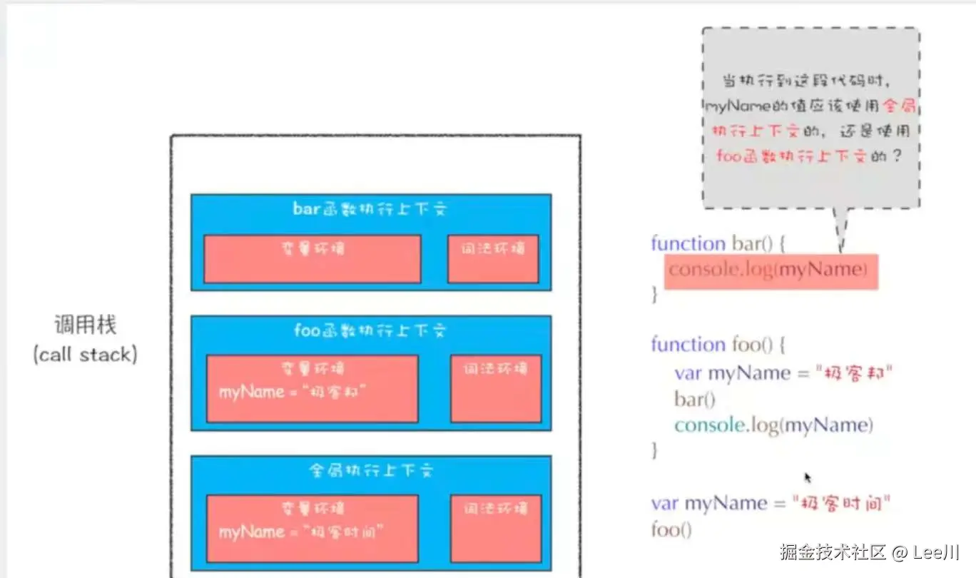 图解 4 :图中的气泡提出了灵魂拷问:"myName 的值应该使用全局执行上下文的,还是使用 foo 函数执行上下文的?" 答案显而易见:全局 。因为