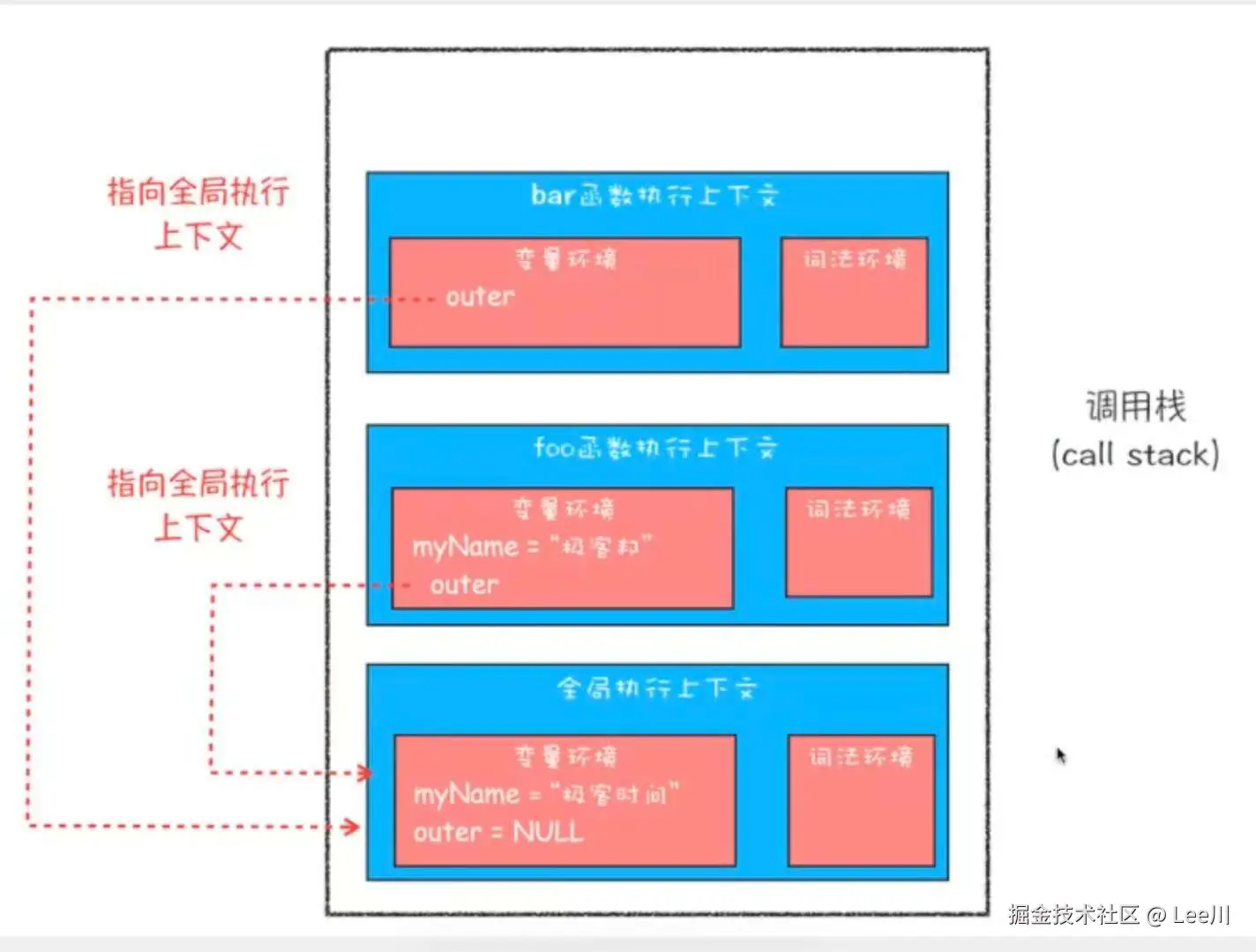 bar,中间是foo,底部是全局。- 请注意红色的虚线箭头(作用域链指向):