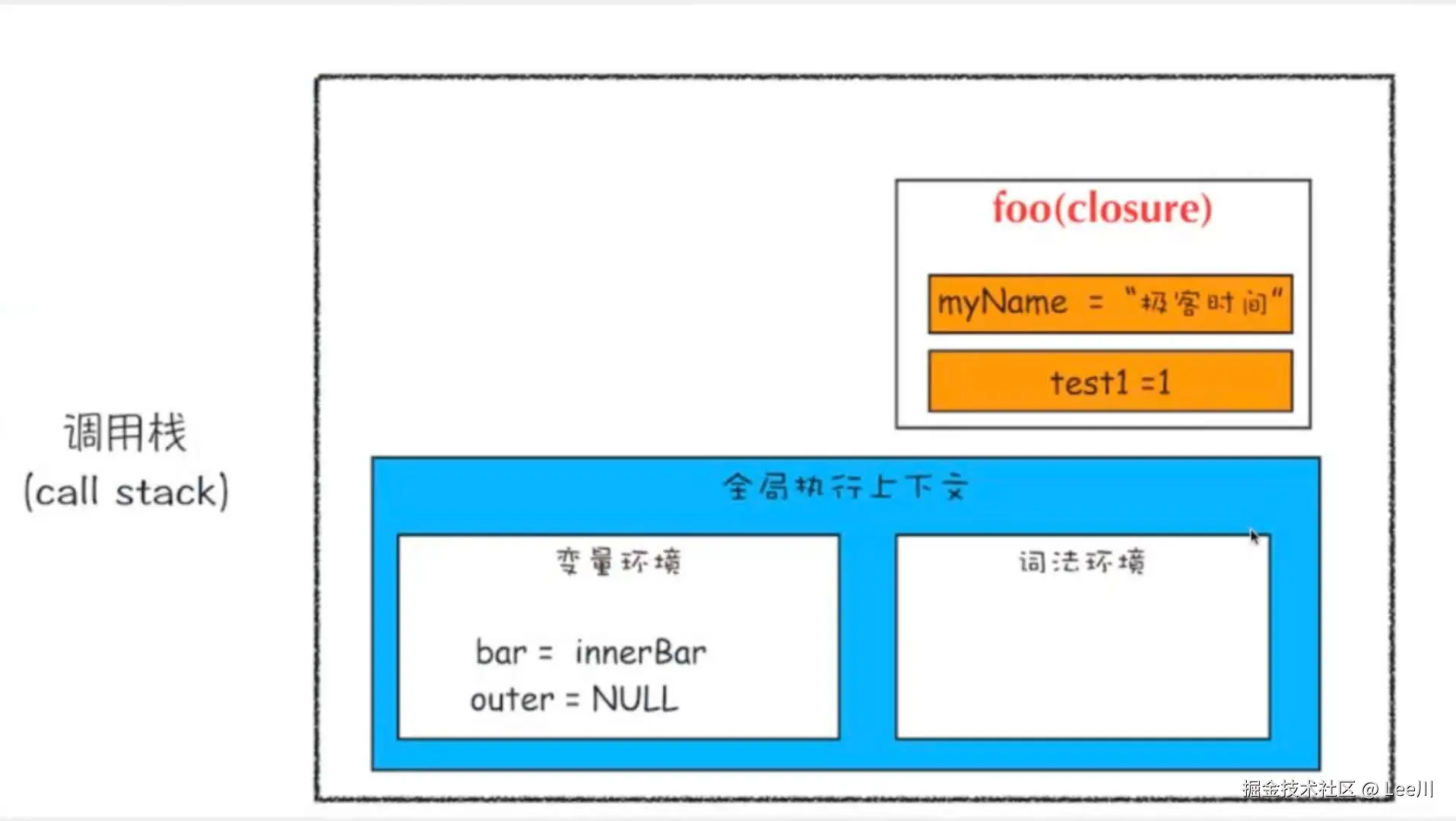 foo函数执行上下文的细节,变量环境中不仅有基本类型,还有函数对象innerBar。当foo返回后,这些变量并没有立即消失,而是成为了闭包的一部分。