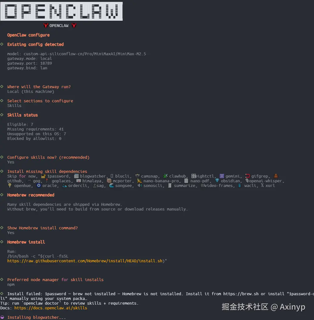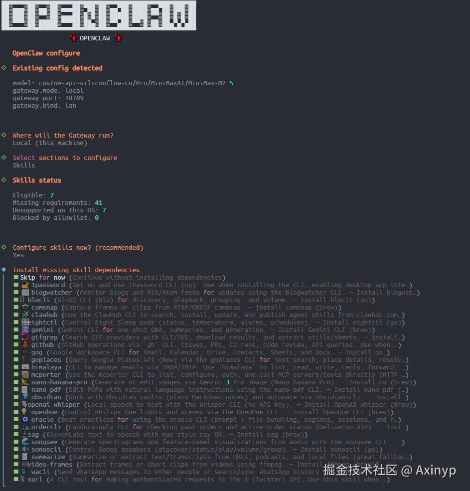 接下来可以继续配置安装Skills,OpenClaw默认自带的Skill 按A直接全选,否则,自行选择想要的按 空格键一个个选,,我这边直接选择全选,选完继续回车进入下一步等待安装即可,如下: