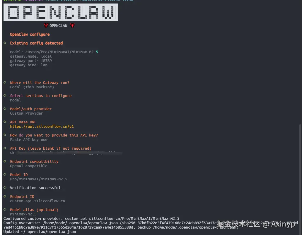 配置文件在 ~/.openclaw/openclaw.json。 接下来我就给我我的操作步骤: 1.准备自己的账号和API API 地址和 key,我用的是硅基流动,使用的模型Id是 Pro/MiniMaxAI/MiniMax-M2.5,去创建一个密钥,后面需要用到