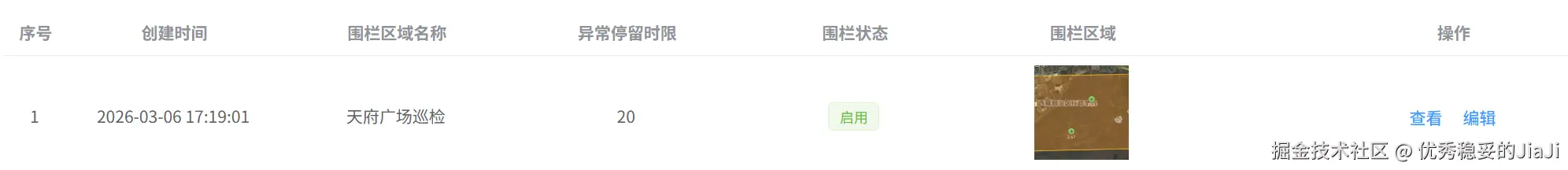 需求背景:在安全巡检系统中,为巡检人员配置"电子围栏",当人员在围栏内(或异常停留超时)触发告警。业务需要一个可配置、可编辑、可校验的围栏编辑器,支持多边形/矩形绘制、相交检测、搜索定位、缩略图生成上传和启停状态设置。