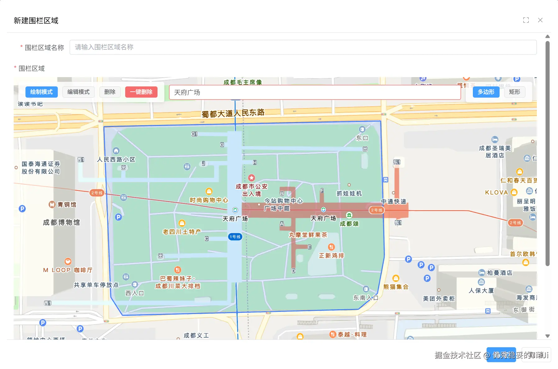 - 地图区域提供绘制/编辑/删除/一键删除、形状切换(多边形/矩形)、地点搜索。