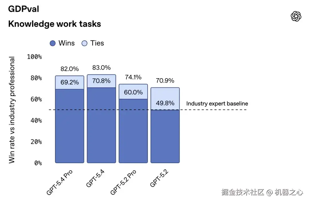 在 GDPval 测试中,GPT-5.4 在 83.0% 的比较中达到或超过了行业专业人士的水平,而 GPT-5.2 的这一比例为 70.9%。