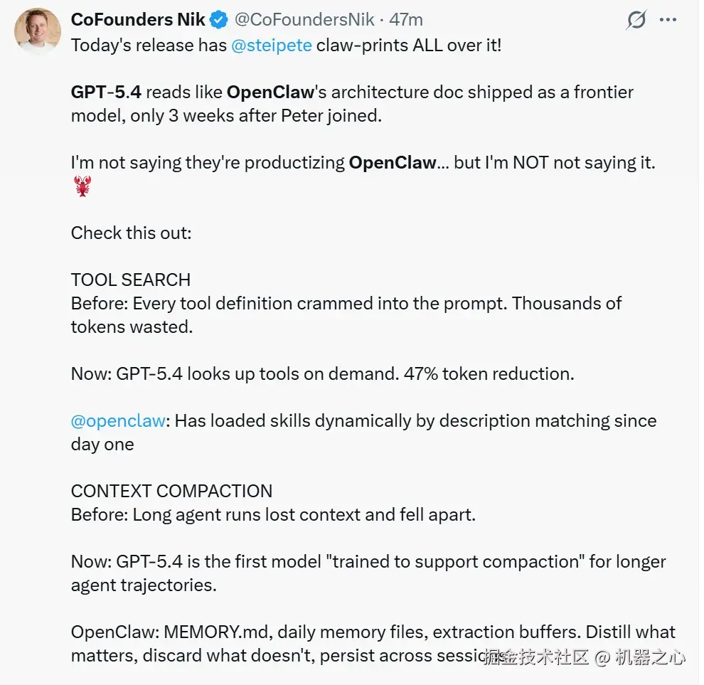还有网友表示:GPT-5.4 的发布,到处都有 Peter Steinberger 的「爪印」!GPT-5.4 看起来就像是 OpenClaw 的架构文档被直接做成了一个前沿模型,而这一切发生在 Peter 加入 OpenAI 仅仅 3 周之后。该网友还进行了一些对比,比如以前所有工具定义都必须塞进 prompt 里,浪费成千上万的 token,现在是 GPT-5.4 可以按需查找工具定义,token 使用量减少 47%。而 OpenClaw 从第一天起就通过描述匹配动态加载技能(skills)。